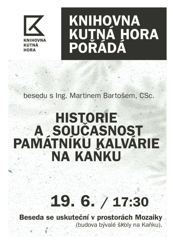 Vážení spoluobčané. Knihovna Kutná Hora si Vás prostřednictvím osadního výboru městské části Kaňk dovoluje srdečně pozvat na besedu pana Ing. Martina Bartoše, CSc. o historii a současnosti památníku Kalvárie na Kaňku. Tato prezentace se uskuteční v prostorách kaňkovské Mozaiky, tedy v budově bývalé pětileté základní školy na Kaňku, U Panské jámy č.p. 243. Začínáme v 17:30 ve čtvrtek 19. 6. 2025. Všichni jsou srdečně zváni.