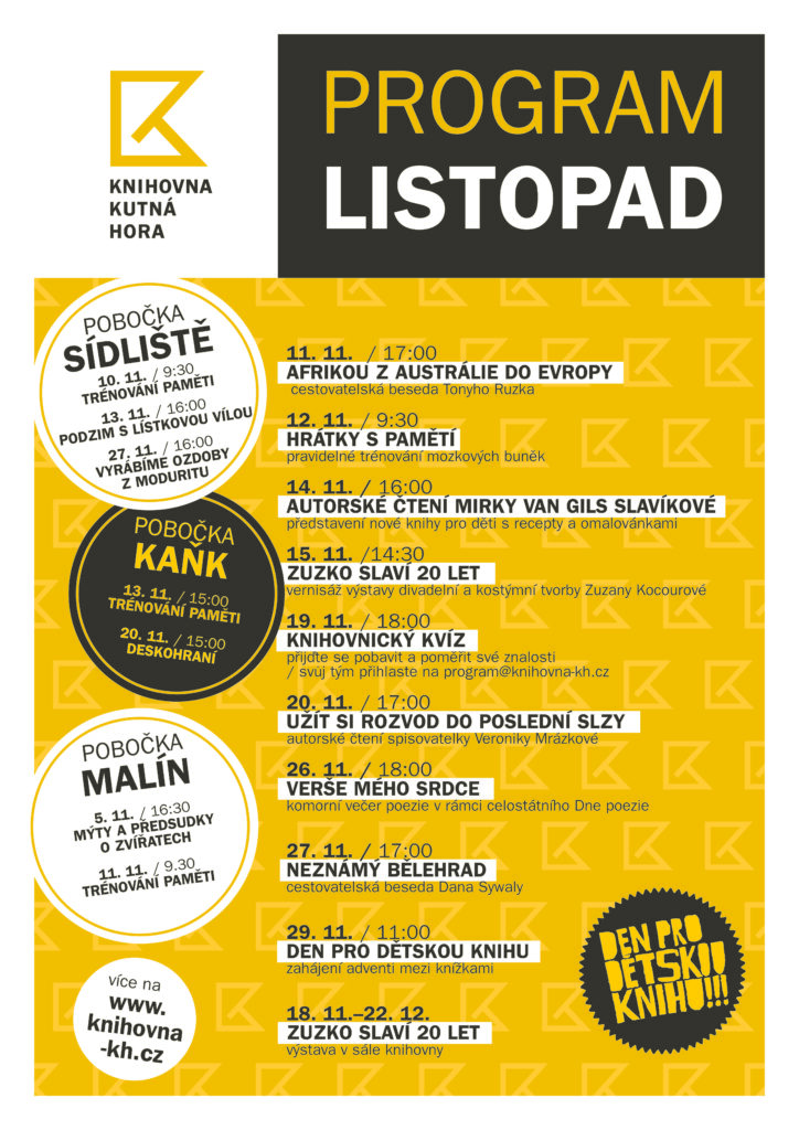 Osadní výbor Kaňk si dovoluje občanům prezentovat program Knihovny Kutná Hora na měsíc listopad roku 2025. Na kaňkovské pobočce se můžete opět těšit na trénování paměti a deskohraní.