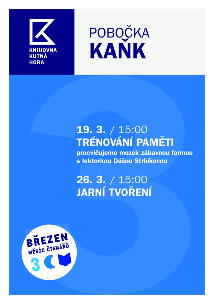 Home > Nezařazené Březnový program Knihovny Kutná Hora – pobočka Kaňk Procvičování mozkových závitů a příprava na jaro. Uveřejnil: Adam Vančo 28. 2. 2026 OsV Kaňk Categories:Nezařazené Adam Vančo Related Posts Nezařazené Dočkáme se na Kaňku obchodu s potravinami? Nezařazené Parkování u Mozaiky v ulici U Lípy Nezařazené Komentář OsV Kaňk k projednávanému záměru výstavby obchvatu Kutné Hory ze den 6.4.2023 Nezařazené Zápis z jednání OsV Kaňk z 30. 9. 2025 Nezařazené Porucha veřejného osvětlení Kaňk Nezařazené Modernizace veřejného osvětlení na Kaňku Napsat komentář Zrušit odpověď na komentářVaše e-mailová adresa nebude zveřejněna. Vyžadované informace jsou označeny *Komentář * Jméno * E-mail * Webová stránka Uložit do prohlížeče jméno, e-mail a webovou stránku pro budoucí komentáře. Post comment Prev Post Program Knihovny Kutná Hora v pobočce na Kaňku pro únor 2026